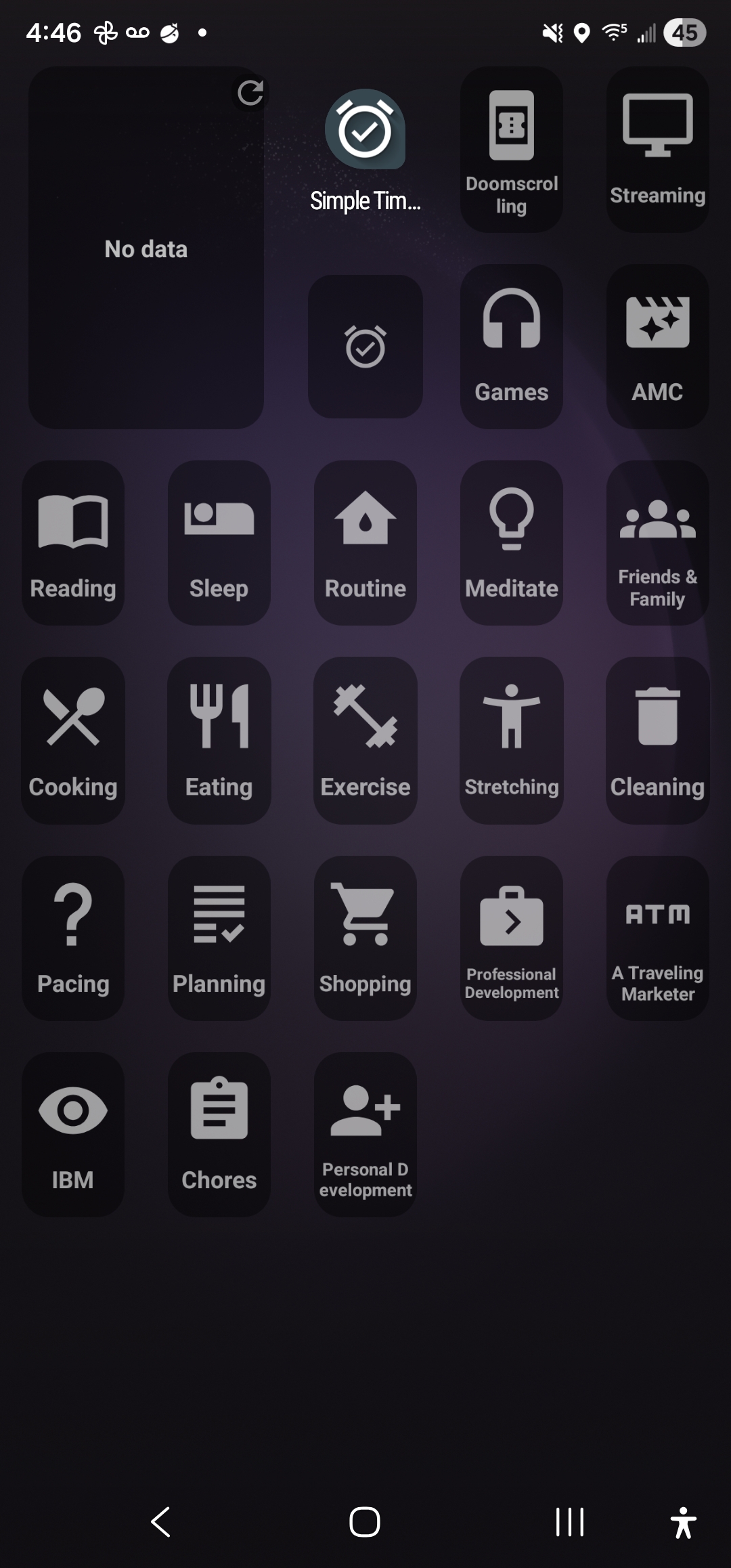 I used Simple Time Tracker on Android (paid version) to log every activity. One activity at a time - no multitasking. If I was eating, I logged “Eating.” If I was scrolling social media, I logged “Doomscrolling.” If I was working, I logged “work.” To make this easier, I kept a home screen with quick access widgets that would allow me to start and stop timers. I also used the app on my watch for on-the-go tracking and would manually update entries as needed in the app.